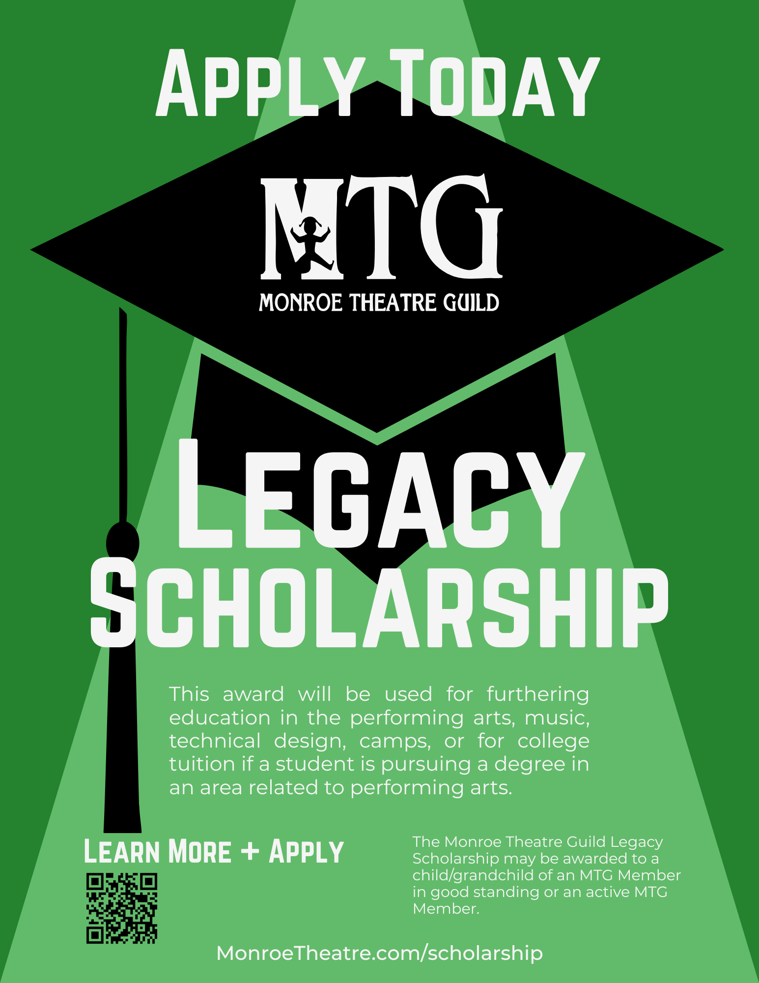The Monroe Theatre Guild Legacy Scholarship may be awarded to a child/grandchild of an MTG Member in good standing or an active MTG Member. The applicant should demonstrate a passion and commitment to the performing arts. This award will be used for furthering education in the performing arts, music, technical design, camps, or for college tuition if a student is pursuing a degree in an area related to performing arts.