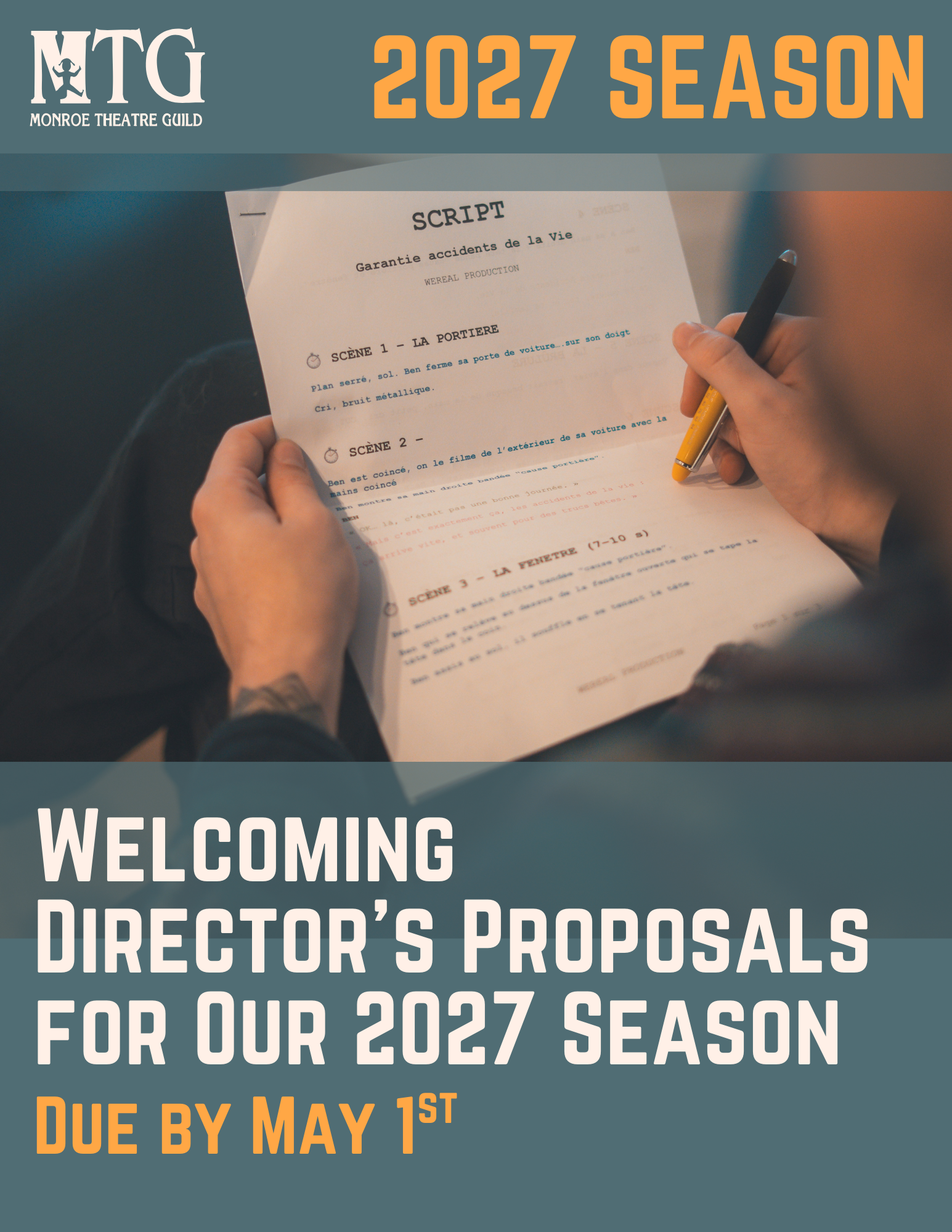 MTG is accepting proposals for our 2027 Season. New Directors, as well as experienced Directors, do you have an idea for a play or musical to appear on Colony Brands Stage? We would love to hear from you!